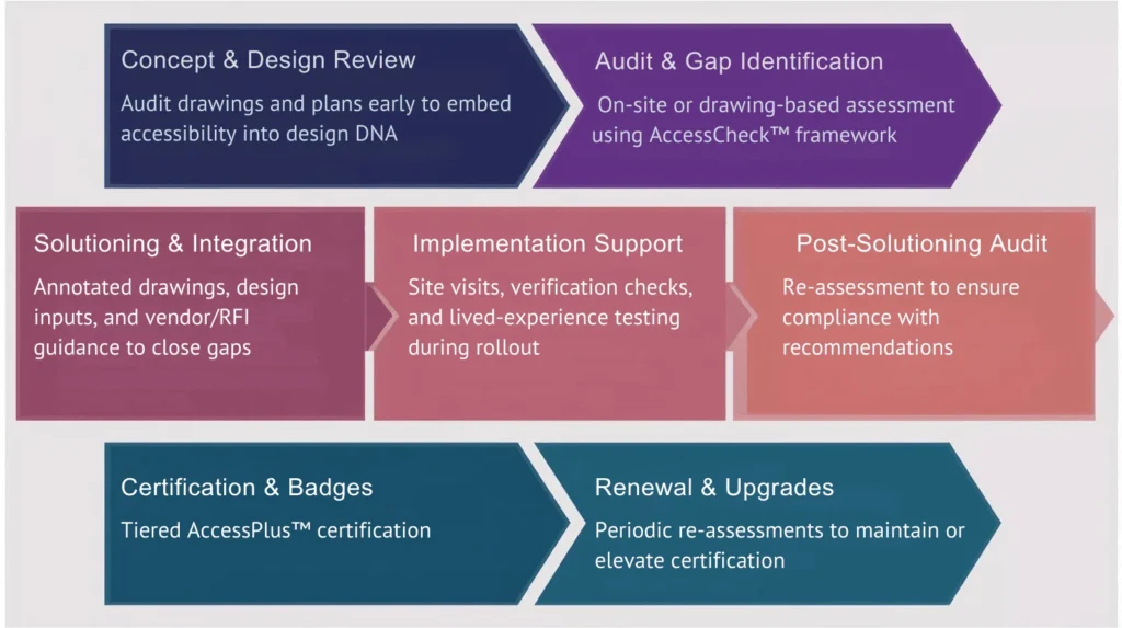 - Audit & Gap Identification: On-site or drawing-based assessment using AccessCheck™ framework